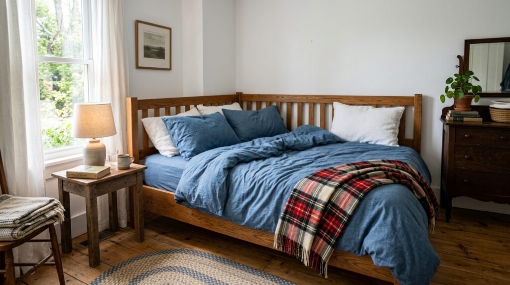 I recommend brands like Gap Home or Target for denim style bedding. It is durable and easy to wash. Pair it with red or orange for a classic Americana feel.