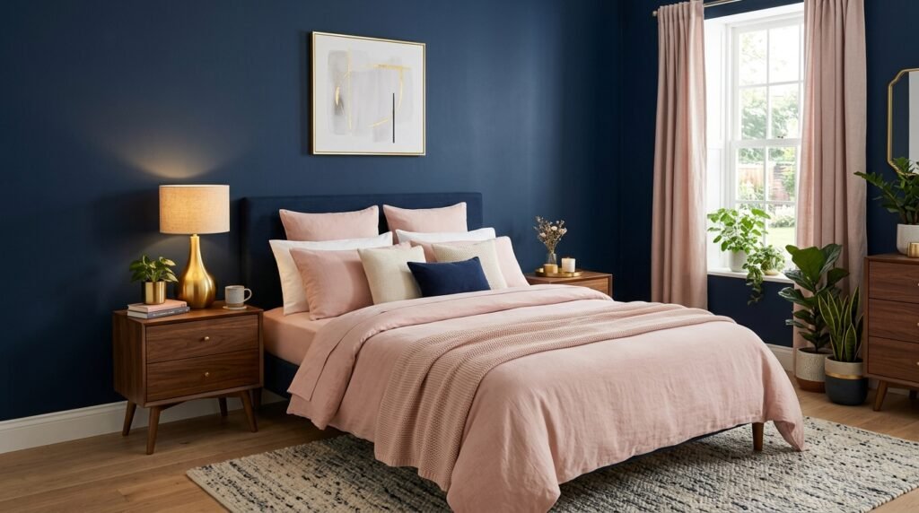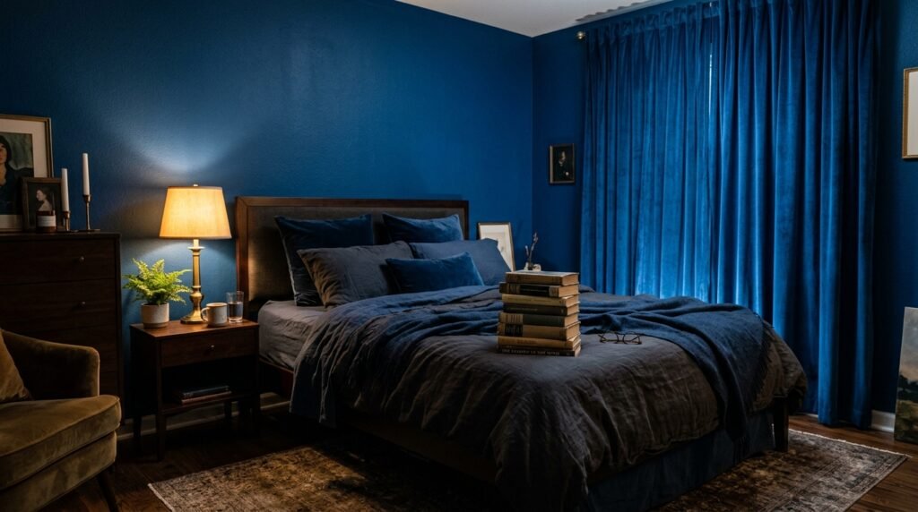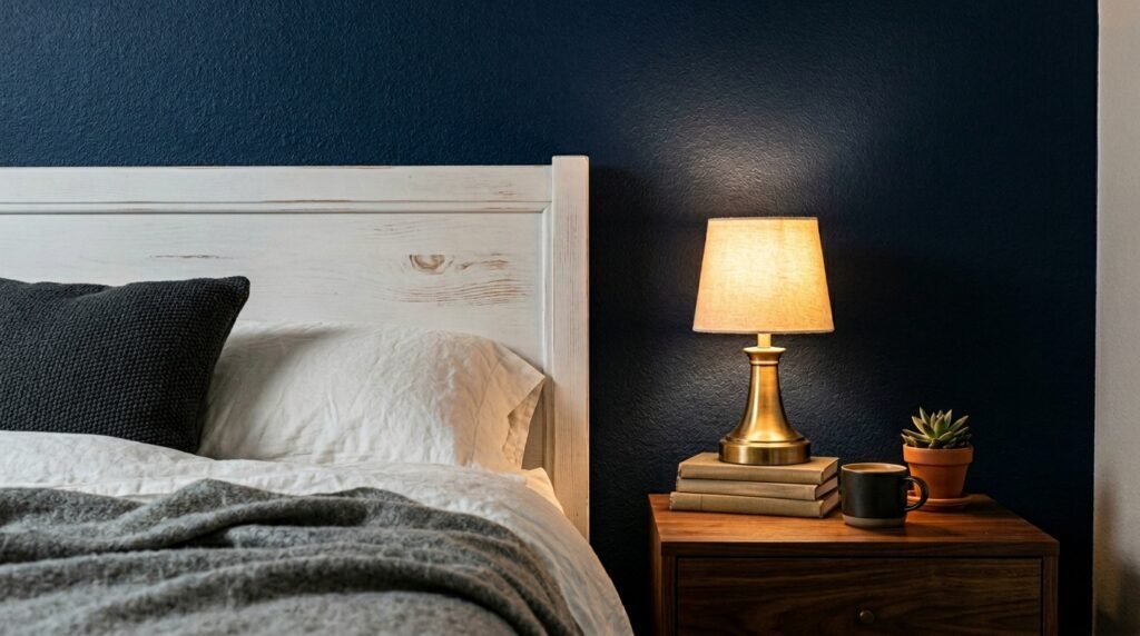 Small rooms can handle navy if you keep the ceiling white. I saw this work in a tiny Brooklyn studio. The dark wall added depth instead of making it feel smaller. Pair it with crisp white Comforter Bedding for a hotel feel.