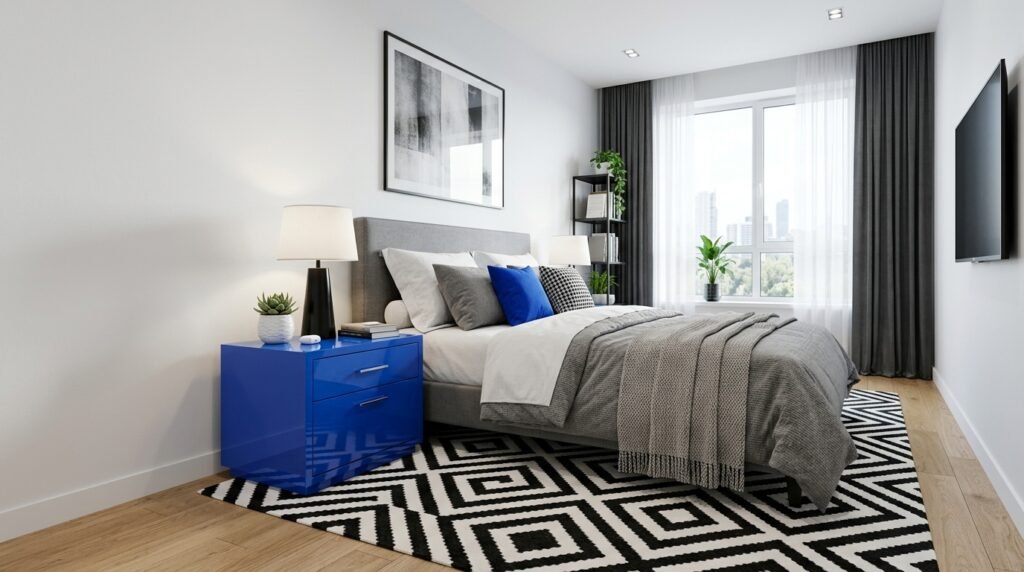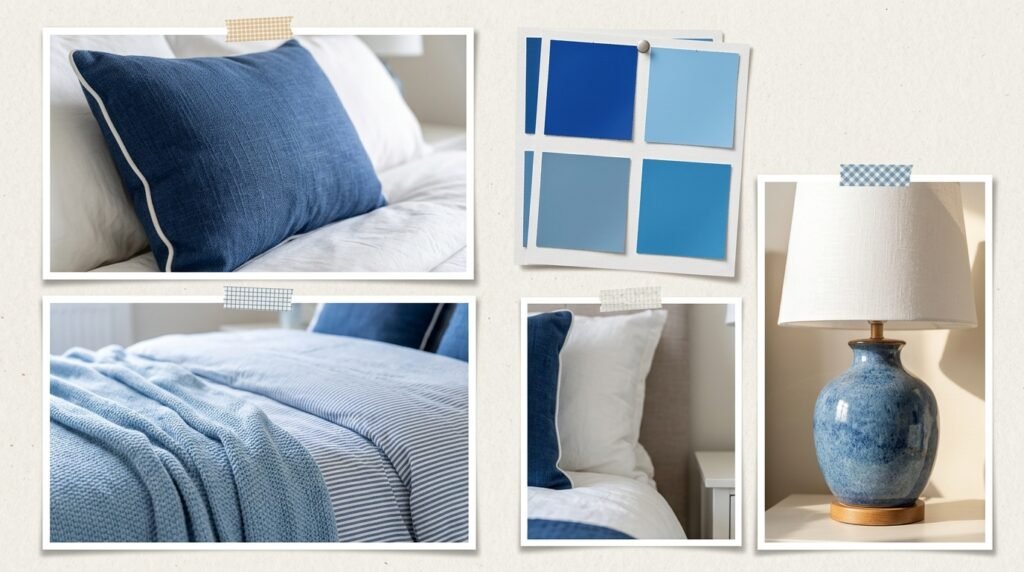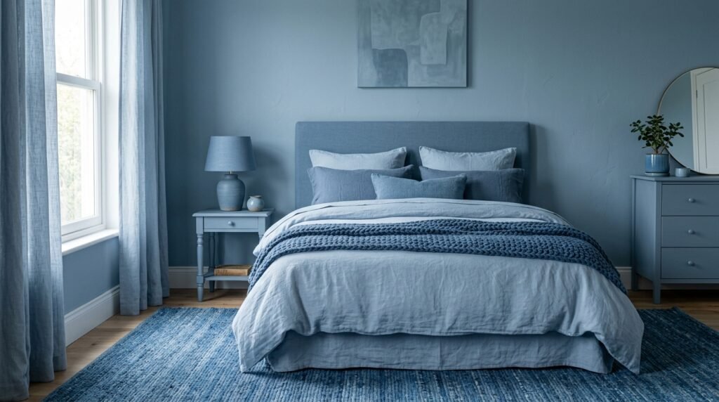 This means using different shades of the same dusty blue. Use a dark rug, medium walls, and light sheets. It creates a layered look without a lot of clutter. I find this helps people focus and relax.