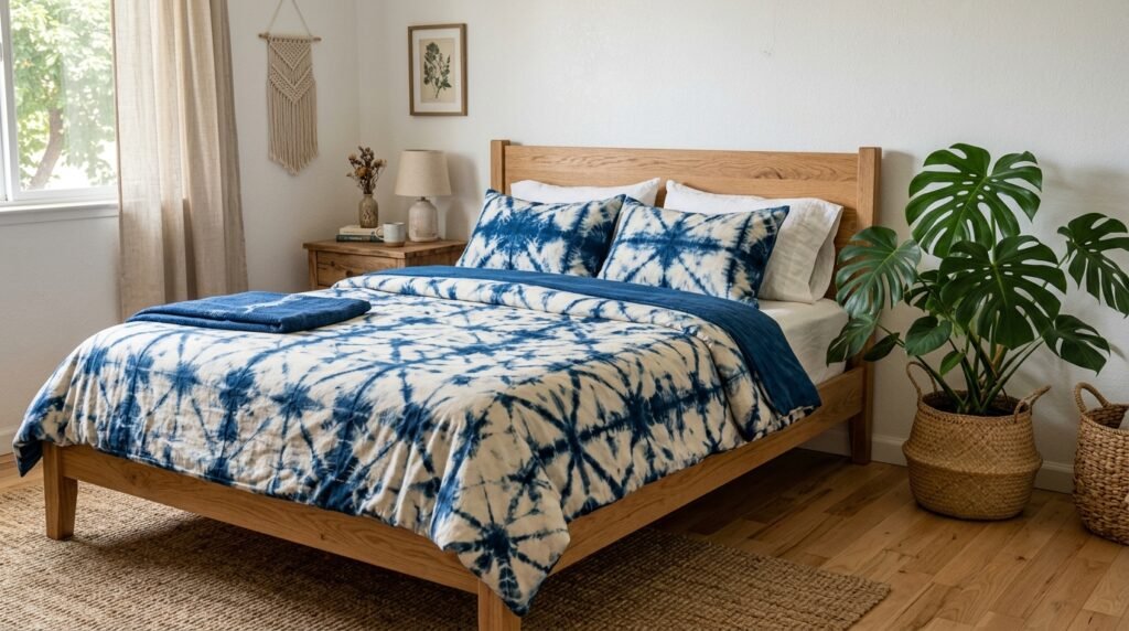 I like mixing these patterns with natural wood. Think oak or birch furniture. It feels earthy and grounded. You can find great Shibori pillows on Etsy from independent artists. This supports small makers while styling your home.
