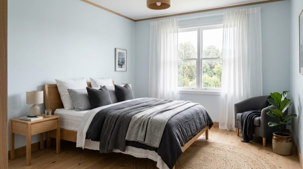 I once used Benjamin Moore Silver Cloud for a client. We added charcoal gray pillows and a slate rug. The result was sophisticated. Use different textures to keep it interesting. A chunky knit gray throw works well over blue sheets.