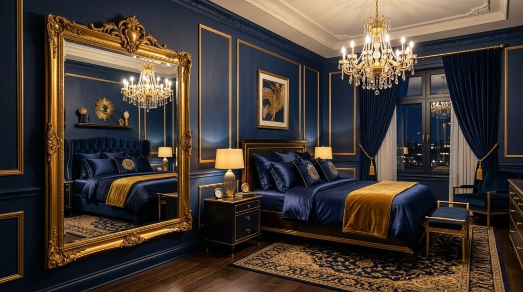 I worked on a master suite in Dallas with this theme. We used silk blue curtains and gold leaf mirrors. The client said she felt like a queen every morning. It is a classic look that never goes out of style.