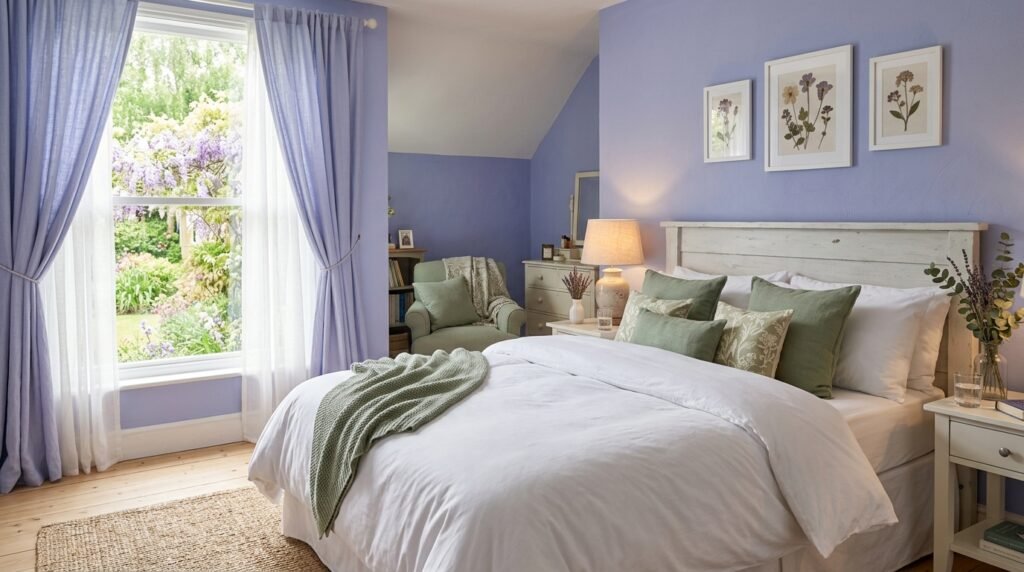 I like pairing periwinkle with sage green. It is a classic garden color palette. I saw this in a bed and breakfast once. It felt very welcoming and sweet.