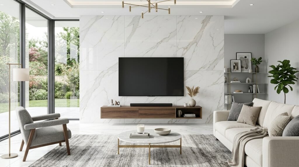 Porcelain tiles now come in huge sizes. Some are five feet by ten feet. They look exactly like marble or concrete. I like them because they are easier to clean than real stone. I used these for a lounge wall design in a modern house.