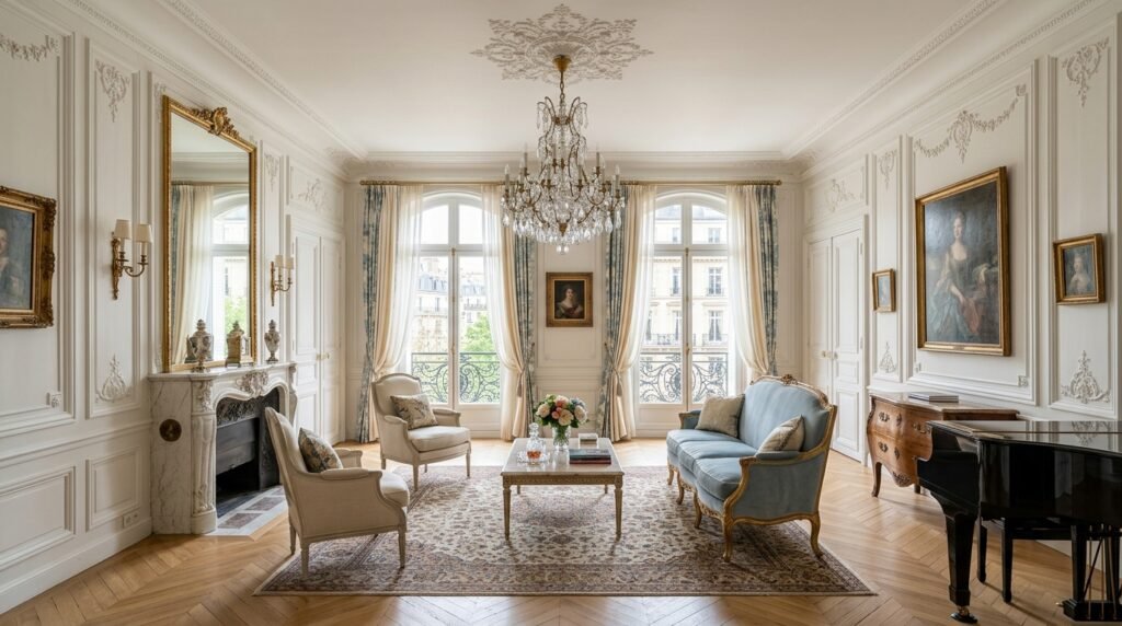 A sophisticated drawing room featuring luxurious decor and refined furniture arrangements.