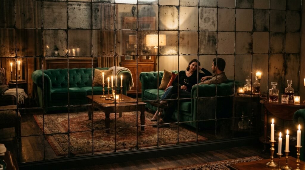 Standard mirrors look like a gym. Antique mirrors look like a palace. They have dark spots and a cloudy look. I saw a lounge wall design using large squares of antique mirror. It made the room look twice as big.