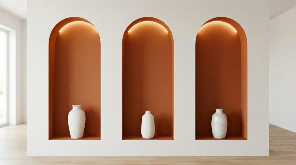 Arches are back in a big way. You can build a shallow arch into your wall. Put a shelf at the bottom. I saw this in a house design that used three arches in a row. Inside the arches, we used a different color.