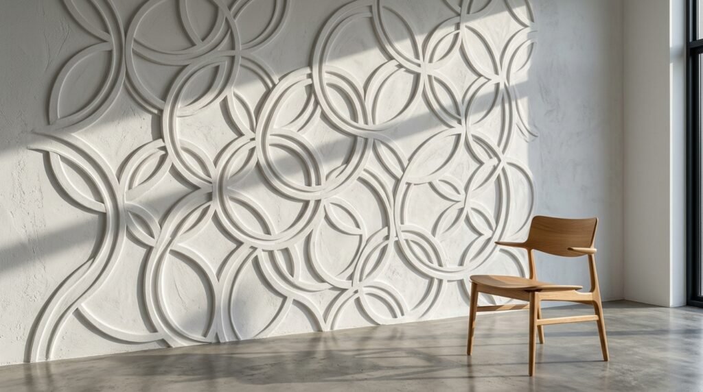 This is a modern way to do wall decor classic styles. You use plaster to create 3D shapes on the wall. Think of circles or triangles that stick out. I saw this in a house design in Los Angeles. It was all white. But the shadows made it look complex.