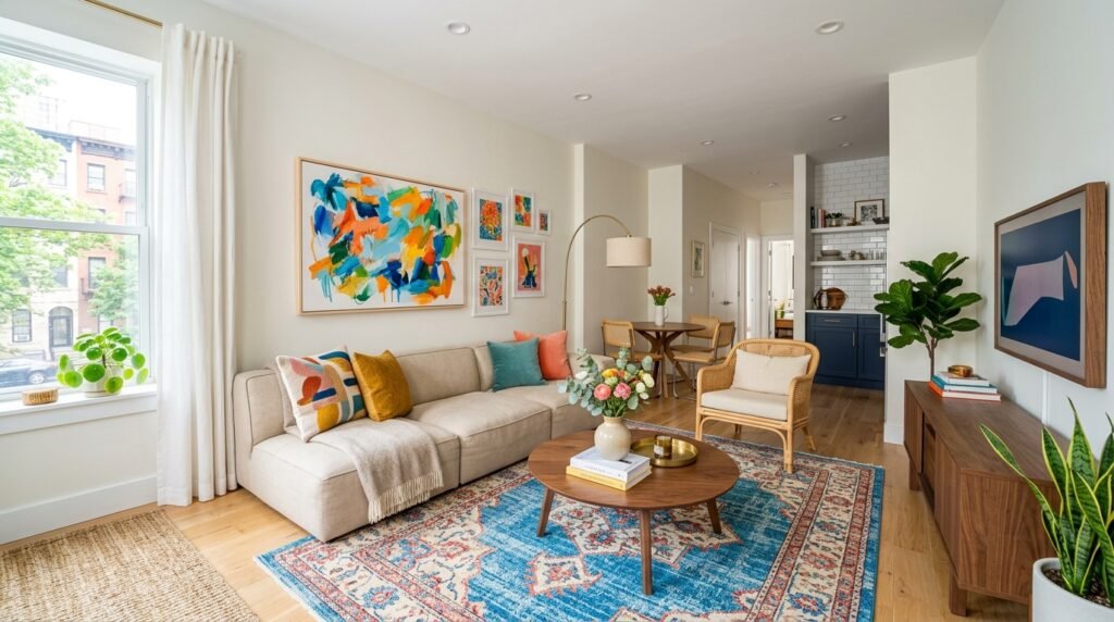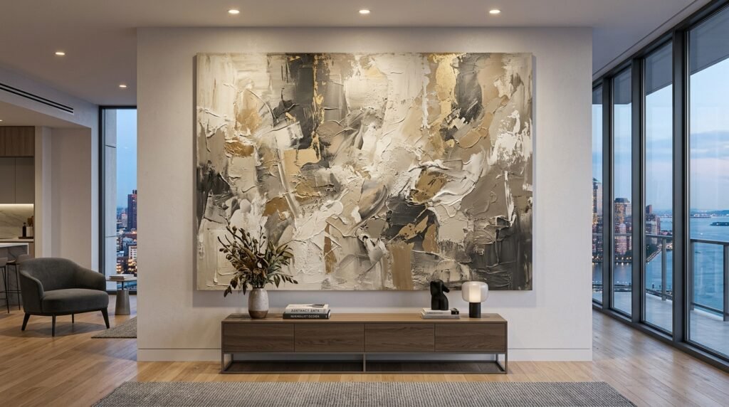 Small apartments often have many small items. This makes the walls look cluttered. One large piece of art creates a focal point. I tell my clients to go bigger than they think. A 40 by 60 inch canvas can anchor a whole minimalist living room.