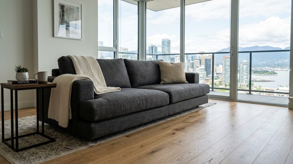 I recommend a low profile sofa with thin arms. This saves inches on the sides and makes the room feel open. Brands like Article and Floyd make great options for small space design. Look for fabrics that are easy to clean if you have pets or kids.