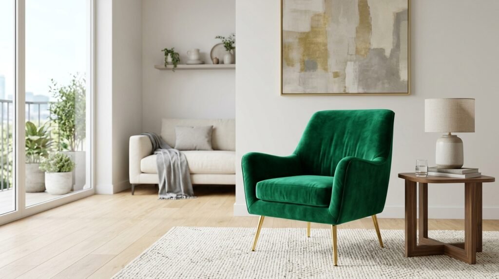 If your sofa is neutral, make your chair bold. I often use a velvet chair in a deep blue or forest green. This adds personality to a modern apartment living room.