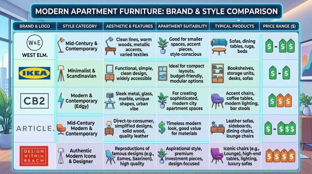 | IKEA | $ – $$ | Small Apartments | Modern Minimalist |