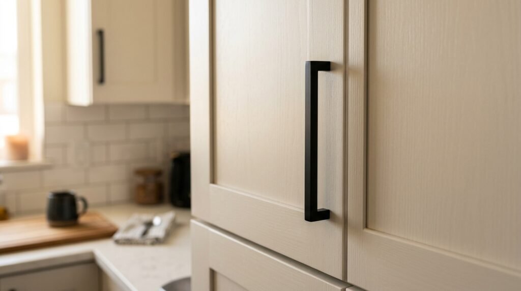 Apartment rentals often have boring handles. I swap them out for brass or matte black hardware. This is a fast way to get an elevated home look.