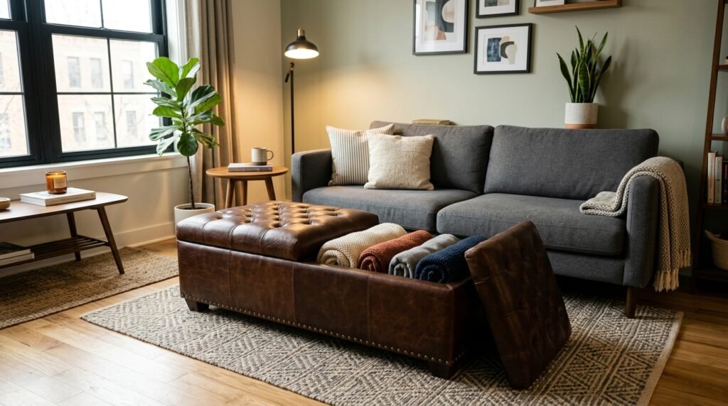 I hate clutter. In a modern apartment living room, there is nowhere to hide things. A storage ottoman is my favorite answer. It holds blankets, games, or shoes.
