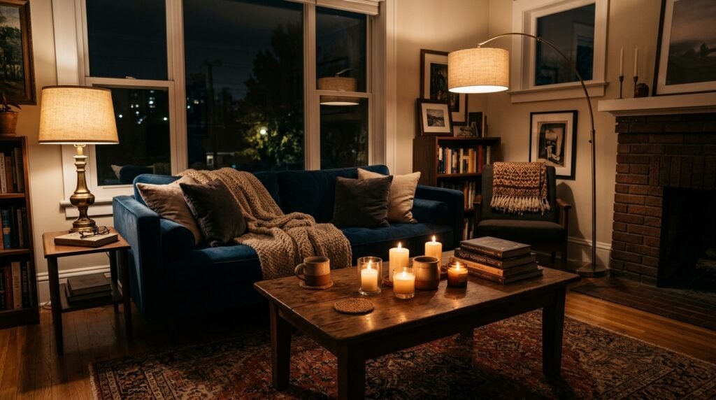 Never rely on one light source. I use a mix of floor lamps, table lamps, and candles. This lets you change the mood of your modern apartment living room.