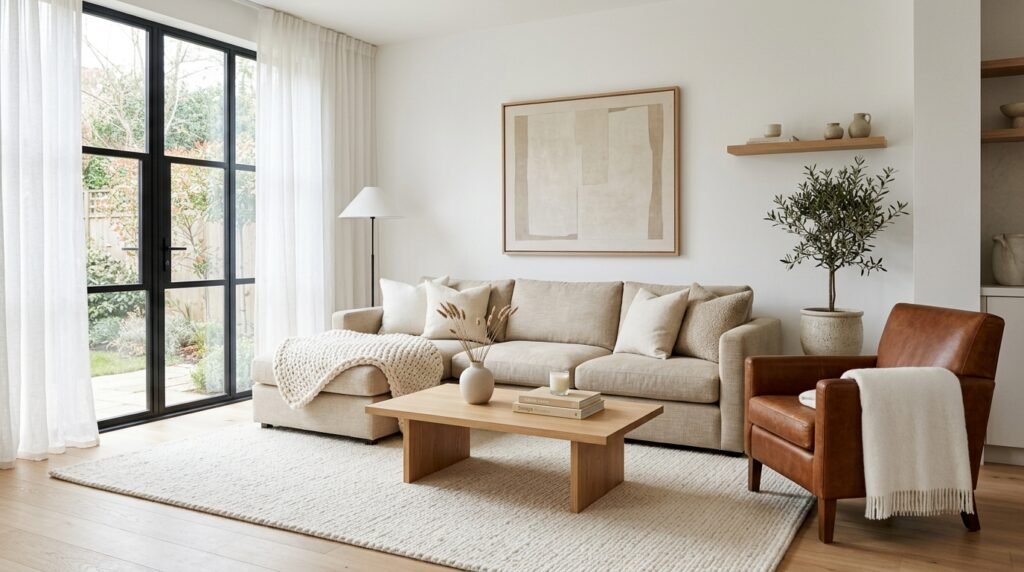 A minimalist living room does not have to be boring. The secret is texture. I use wool rugs, leather chairs, and cotton pillows. Keep the colors the same but change the feel.
