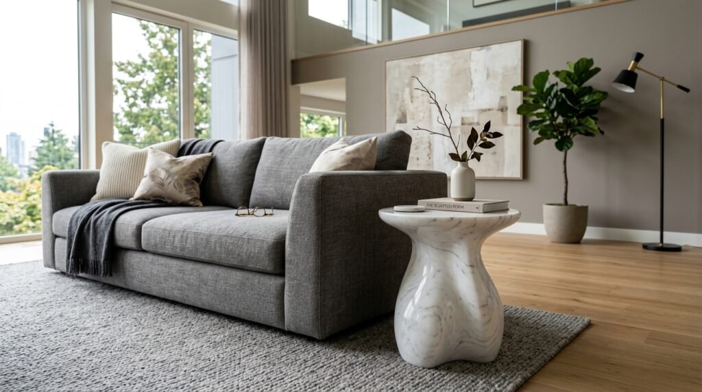 A side table can be a work of art. I look for tables made of stone, metal, or concrete. These materials add weight and interest to a minimalist living room.