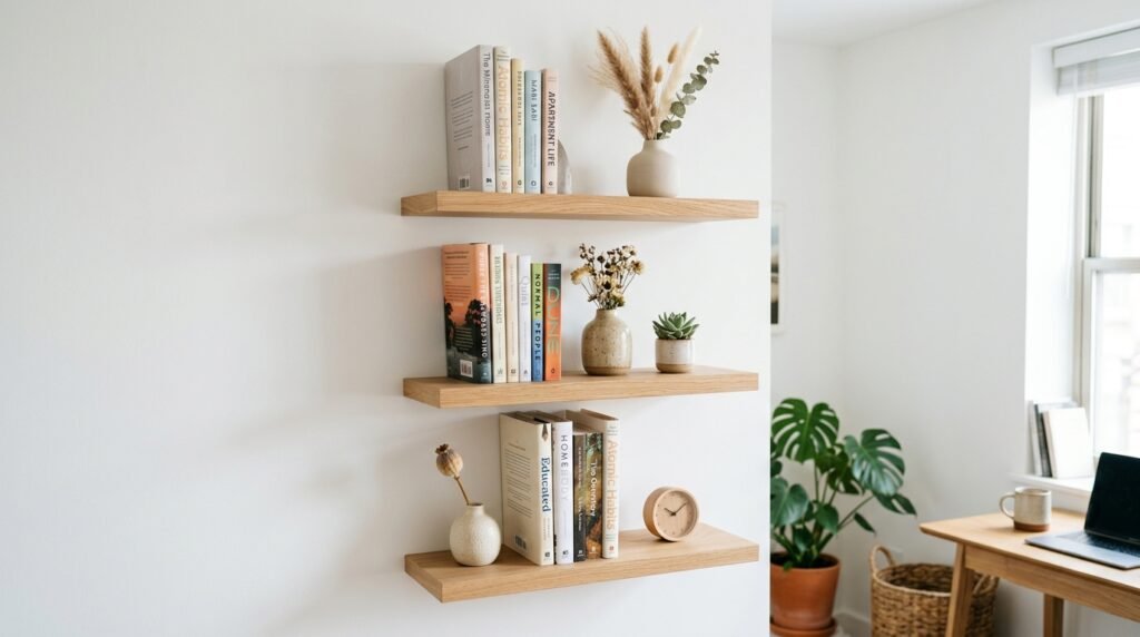 Floor space is gold in small space design. Use your walls instead. Floating shelves hold books and decor without the footprint of a cabinet.