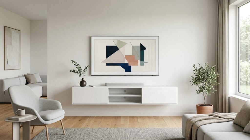 The TV area often looks messy. A floating or very slim media console keeps it clean. I look for units with doors to hide cables and boxes.