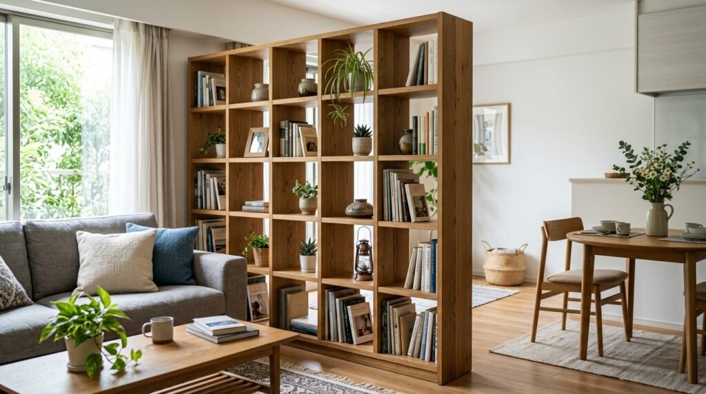 The Kallax from IKEA is a cheap option. For something more sleek, look at the Stax from CB2. I used one to separate a bed area from a living area. It worked without making the room feel smaller.