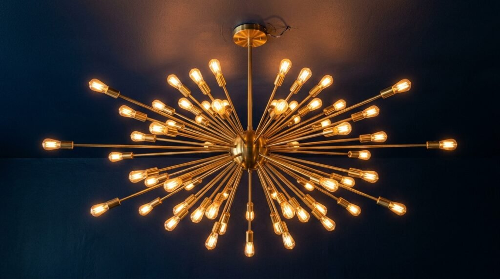 Lighting acts as jewelry for your room. A Sputnik chandelier has arms reaching in every direction. It draws the eye upward. In a Mid Century Guest Bedroom this piece becomes a focal point. I installed a brass Sputnik in my own guest room last year. It changed the whole mood. Use warm LED bulbs to keep the glow soft. Avoid cool white lights. They make the wood look gray and cold.