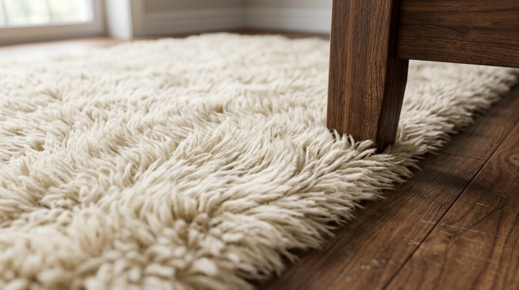 A rug anchors the bed. A high pile shag rug adds a soft touch to the hard wood floors. Look for cream or off white colors. The texture creates a nice contrast with the smooth walnut furniture. I recommend a rug that extends at least two feet past the sides of the bed. This gives your feet a warm place to land in the morning. I’ve seen low-quality rugs shed too much. Spend a bit more on a wool blend for durability.