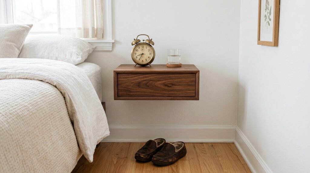 In a Mid Century Small Bedroom floor space is gold. Floating nightstands mount directly to the wall. They leave the area under the table open. This is where you can tuck your slippers. It makes cleaning easier too. I love models with a single small drawer. It hides your phone charger and lip balm. This keeps the top surface clear for a single book and a lamp.