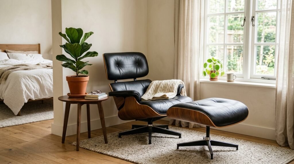 Every bedroom needs a corner for sitting. Look for a shell chair or a wooden lounge chair. The Eames style is a classic choice. In a Mid Century Modern Small Bedroom pick a chair with a slim profile. I once bought a bulky recliner for my bedroom. I regretted it within a week. It blocked the walkway. Now I use a simple wood frame chair with a leather seat. It looks like art even when I am not sitting in it.