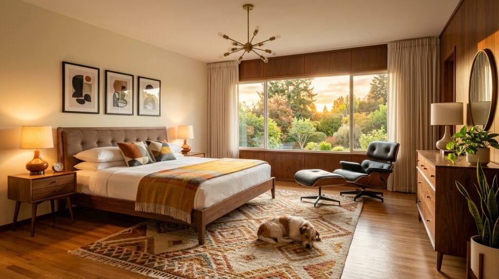 Walnut is the king of Midcentury Bedroom Design. It has a rich dark grain. It adds instant history to a new room. I recommend choosing one main wood tone and sticking to it. If your bed is walnut your nightstands should match. This creates a cohesive look. Avoid mixing too many different woods like oak or pine. It can make the room look messy. Walnut develops a beautiful patina over time. It is a smart investment.