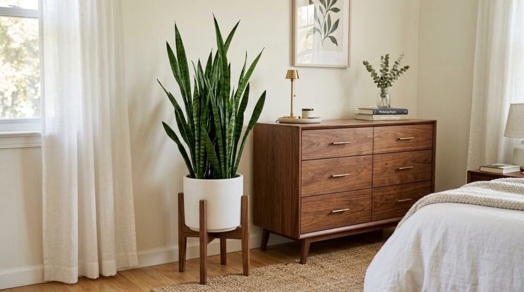Plants were a staple in 1960s homes. A tall Snake Plant or a Fiddle Leaf Fig fits the vibe. The green leaves pop against the brown wood. Place a plant in a ceramic pot with a wooden stand. This elevates the plant and follows the tapered leg rule. I have three plants in my bedroom. They improve the air and make the room feel alive. If you have a black thumb start with a Pothos. They are hard to kill.