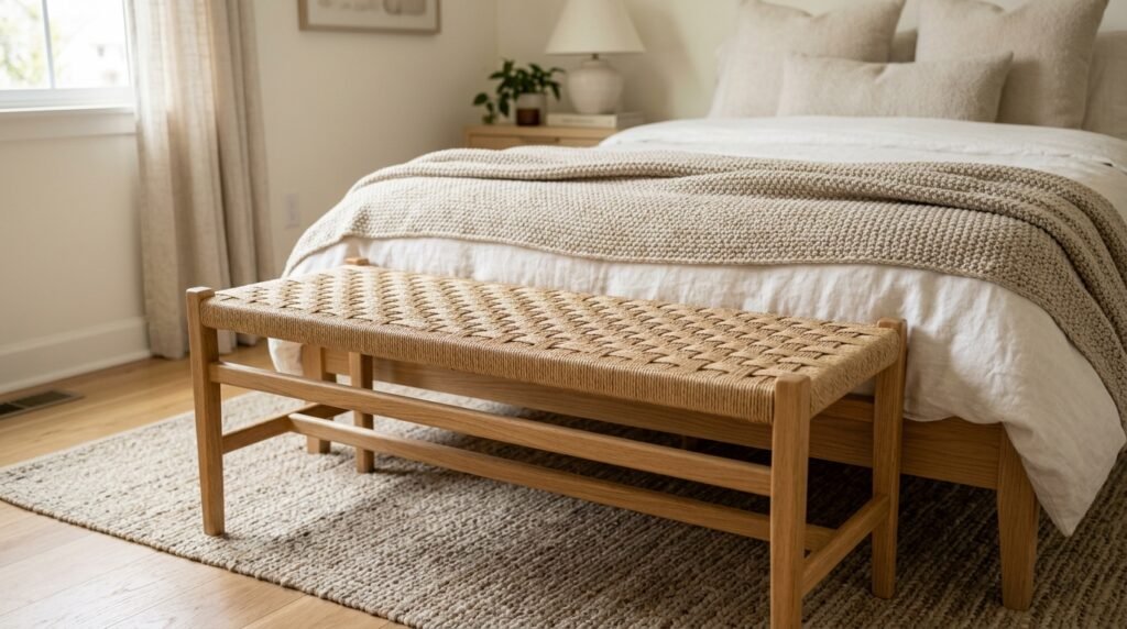 Place a woven bench at the foot of your bed. It provides a spot to put on your shoes. It also fills the empty space. Look for a bench with a paper cord or cane seat. This adds a different texture than the bed. In a Mid Century Modern Small Bedroom a slim bench fits without blocking the path. It makes the room feel complete.